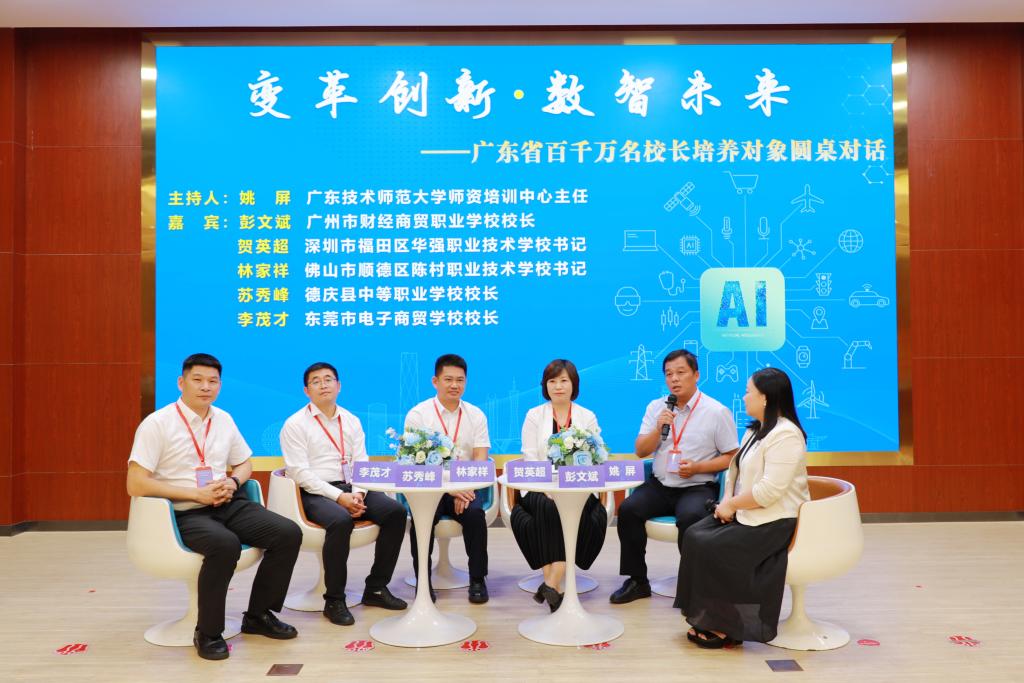 在圆桌对话环节,2024年广东省中小学“百千万人才培养工程”中职名书记名校长与学校师资培训中心主任姚屏教授共同以“变革创新,数智未来”为主题,围绕“在中职什么样的校长是一名好校长”“在就业、升学双导向的背景下,学校应该走什么样的发展路径”两个问题进行圆桌对话和互动交流,分享了中职名校长成长路径与学校高质量发展经验。