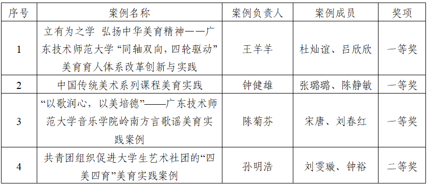 据悉,本次活动是广东省教育厅为贯彻落实《关于全面加强和改进新时代学校美育工作的意见》,进一步深化我省高校美育工作综合改革,形成具有引领性、突破性、示范性的做法、举措和经验,推进全省高校美育工作高质量发展而举办的一项重要活动。本次活动,白菜官网党政领导高度重视,教务处(美育中心)精心组织策划,各职能部门及二级学院积极凝练美育建设成果。期间,美育中心特邀请了校内外专家对白菜官网4个案例进行多轮打磨,最终在本科组的数百个案例中脱颖而出,获得一等奖3项、二等奖1项。