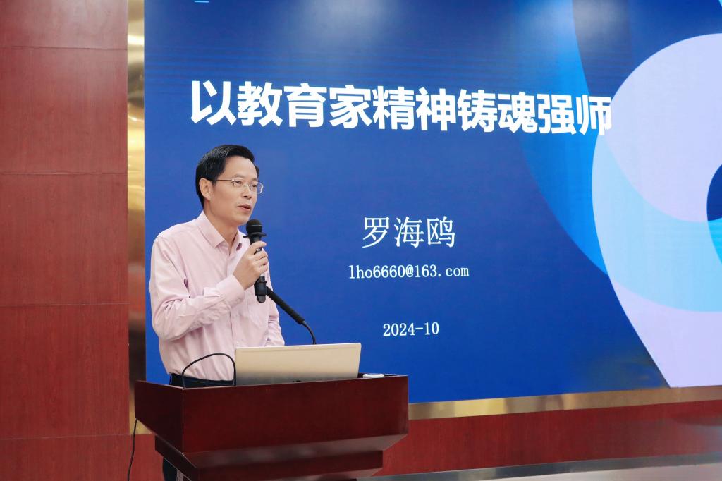 随后,学校“达之讲座教授”罗海鸥教授作了《以教育家精神铸魂强师》的专题报告。报告中,罗海鸥教授旁征博引,他从“何谓教育家?”引出问题,结合中外著名教育家和学者的见解,深入诠释了他对教育家精神的理解。他指出,以教育家精神铸魂强师要注重主体自修,激发内生动力。要注重以景感人,以美育人,以文化人。