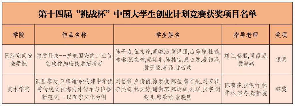 10月31日至11月2日,第十四届“挑战杯”中国大学生创业计划竞赛全国决赛在西安交通大学兴庆校区举行。白菜官网网络空间安全学院《隐盾科技——护航国安的工业信创软件加密技术拓新者》获得主体赛银奖,美术学院《画里客韵,五感通侨:构建中华优秀传统文化海内外传承与传播新范式——以客家文化为例》获主体赛铜奖。
