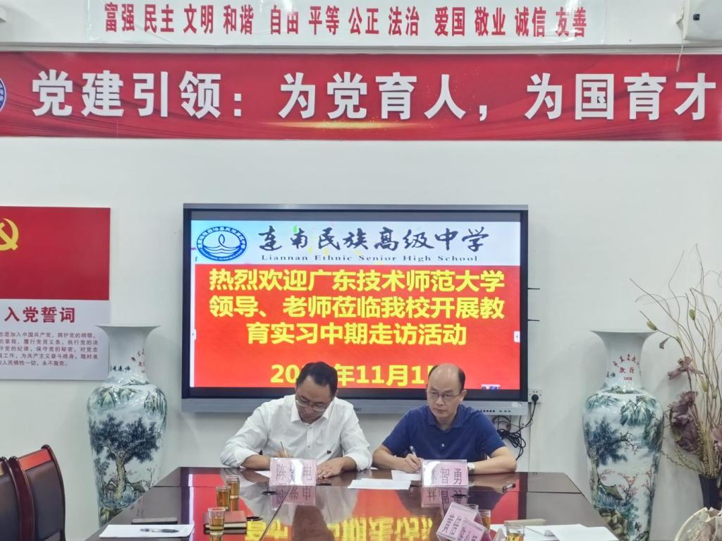 抵达连南瑶族自治县后,检查小组与民族高级中学的校领导及教师代表进行了深入的座谈交流。座谈会上,林智勇副院长首先介绍了学校近年来在教育实习方面的改革举措和取得的成效,强调了“双百行动”对于推动校院内涵式发展、提升人才培养质量的重要意义。民族高级中学校长对检查小组的到访表示热烈欢迎,着重分享了学校在支持教育实习、促进教师专业成长方面的经验和做法。双方围绕深化合作、资源共享、协同创新等方面展开了深入交流与讨论。