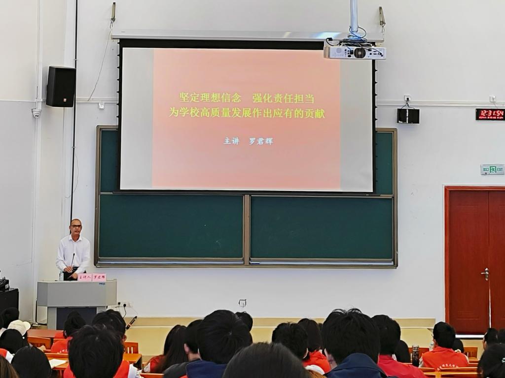 11月8日,河源校区第二期学生干部“赋能”素质训练营第九讲在河源校区大讲堂205举行,河源校区党委书记、数据科学与工程学院党委书记罗君辉以《坚定理想信念,强化责任担当,为学校高质量发展作出应有的贡献》为题,为学员们带来了一堂精彩的讲座。河源校区管委会相关负责同志、学生事务部全体成员、河源校区辅导员及训练营全体学员近200人参加了活动。