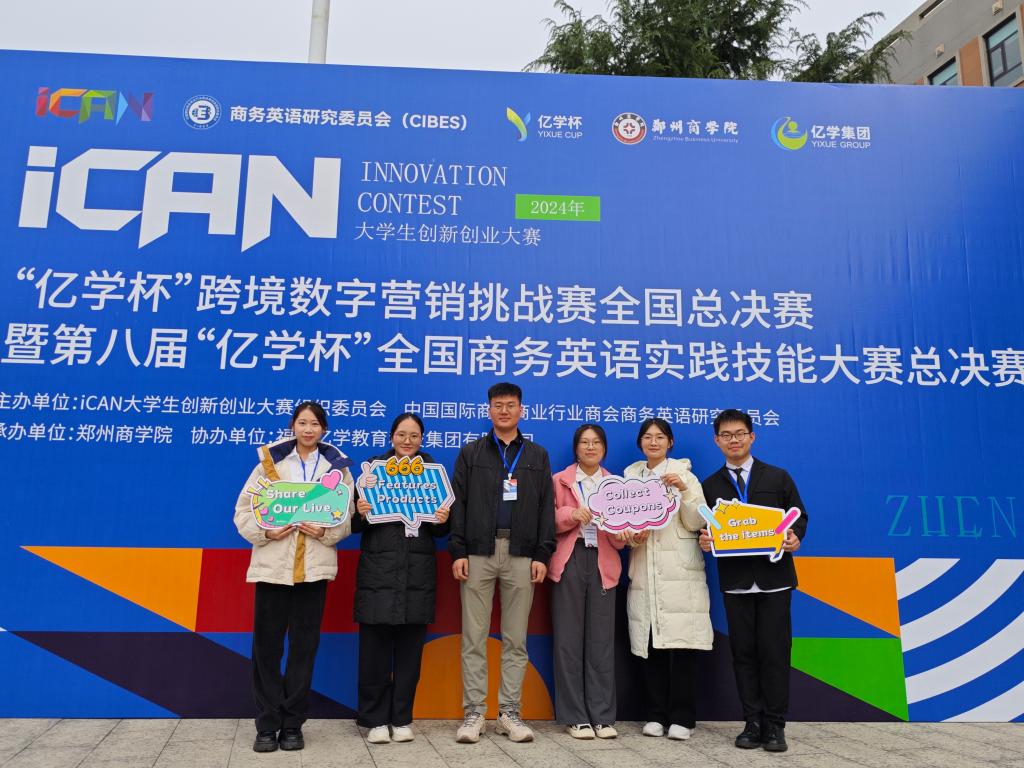 11月16日,iCAN大学生创新创业大赛“亿学杯”跨境数字营销挑战赛全国总决赛暨第八届“亿学杯”全国商务英语实践技能大赛决赛在河南省郑州市郑州商学院举行,由谭雯婷、李逸涵两位老师指导,外国语学院学生吴姞霓、林梓彤、唐乐儿、张怡灵、徐浩骏组成的参赛队伍荣获全国一等奖。