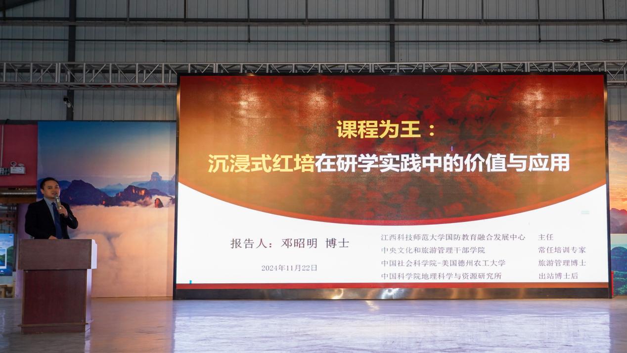 此外,江西科技师范大学国防融合与发展中心主任邓昭明博士作了《课程为王:沉浸式思政课在研学实践中的价值与应用》的专题讲座。他从自己红色文化资源的研究讲起,讲述了江西、福建、湖南三省长征文化公园建设和保护规划的过程,并以音乐国防课《人民的军队》为例,展示了如何用音乐来做国防教育,红色教育怎样做才能打动人,才能让红色文化入脑、入心。河北省旅游协会研学旅游分会会长王明建结合自己十几年从事研学实践教育的经验,作了《红色研学路线设计与开发》的讲座。王明建分别从教育的角度和文旅的角度分析了研学实践教育对孩子、家庭、国家的重要意义,从运营角度谈了研学实践教育基地应该考虑哪些因素,并以西柏坡等红色经典线路为例分析了红色研学路线设计与开发的要点。丹霞山保护区自然学校校长余东亮分享了丹霞山研学资源的整合方式、课程体系建设的过程及研学指导教师培训。他还着重分析了丹霞山的研学实践教育理念,社区联动的研学实践教育模式以及进一步的建设设想。