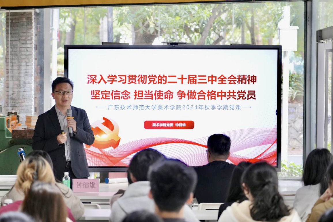 为学习宣传贯彻党的二十届三中全会精神,引导入党积极分子及发展对象端正入党动机、坚定理想信念、勇担时代使命,11月21日,美术学院党委书记钟健雄在东校区非遗大师工坊为师生讲授了题为《深入学习贯彻党的二十届三中全会精神坚定信念担当使命争做合格中共党员》的党课,美术学院师生党员代表、全体入党积极分子及发展对象和学生干部代表等参加了党课。