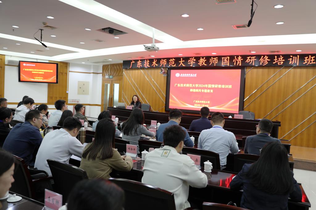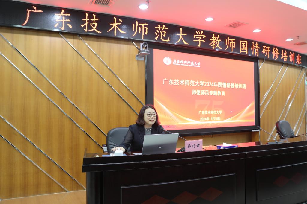 为帮助参训教师提高思想政治素质和师德素养,涵养良好师德师风,近日,学校党委常委、党委教师工作部、人事处处长许竹君教授以《弘扬教育家精神,做新时代“大先生”》为题,在仁化县海事丹霞基地为学校第二期教师国情研修培训班(服务“双百”系列)全体学员讲授了一场主题鲜明、目标明确的师德师风专题教育课。